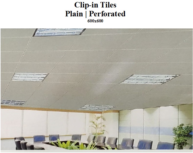 Clip-in Tile false ceiling system made of 0.5 mm thick G.I. steel/0.7 mm thick Aluminium sheet, coil coated/powder coated with approved shade, with 20/50 micron respectively on the front side. The size of 0.5 mm thick beveled edge tile shall be 600mm x 600mm (with or without perforation of 2.5mm dia).